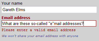 In the interests of best practice web form techniques I want the email address label to be bold and red, as well as the error message. To do this I had to hack jquery.validate.js so that it calls a local javascript function with the same name as the server function (with “_response” appended to it) :