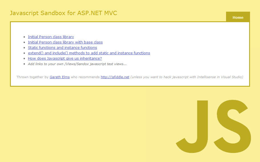 Then edit the Home/Index view to add a link to your new test. As you can see from the screenshot in the link I’ve added the html helper @Html.SandboxLink(sandboxViewName,description) to simplify generating links to your Javascript tests. I want to automate this at some point in the future so you only need to create the views.